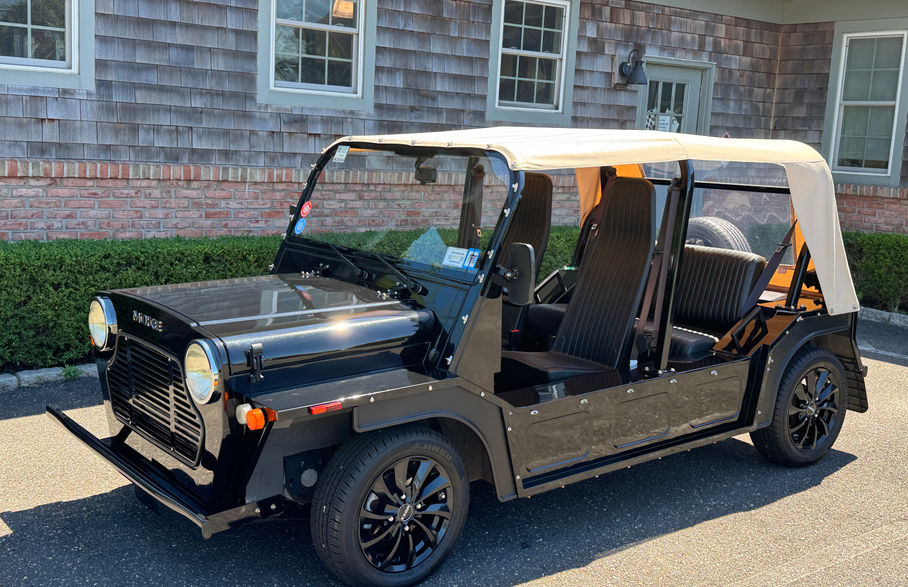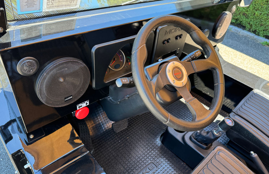 This 2018 Moke America Electric Moke is powered by a 60-volt battery system linked to a 7.5-kilowatt AC electric motor and a direct-drive transaxle. The car is finished in black over black vinyl upholstery, and additional equipment includes 14″ alloy wheels, a tan bimini top, a slotted grille, roll bars, high-back front seats, a rear bench, and a rearview camera. The current owner purchased the car in 2023, and the batteries were replaced in preparation for the sale. This Electric Moke is offered on dealer consignment with a charging cable, service records, a car cover, and a clean New York title.